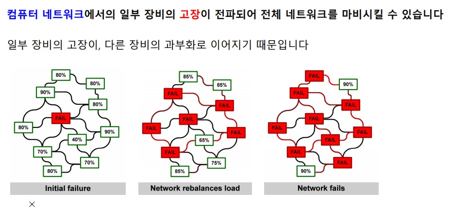 컴퓨터 네트워크 같은 경우 일부분만 고장나도 다른 부분에서 과부하가 걸려 금방 전체가 고장난다