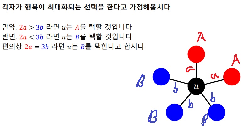 u가 A를 선택하면 행복도가 +2a만큼 오르고 B를 선택하면 행복도가 +3b만큼 오른다.