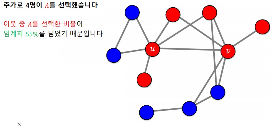 동그라미 부분은 이웃 중 A를 선택한 비율이 임계치보다 크므로 선택을 바꾼다