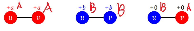 둘 다 A를 사용하면 각각 행복도가 +a만큼 오르고 둘 다 B를 사용하면 각각 행복도가 +b만큼 오른다.