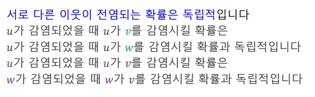 서로 다른 이웃이 전염되는, 각 전염과정은 모두 서로 독립이라고 가정하는 것이 독립 전파 모형이다.