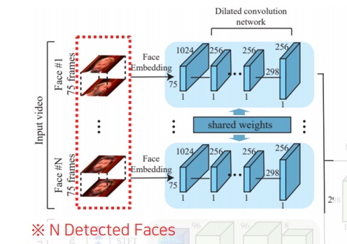 N명의 얼굴이 영상에 등장한다고 하면 일정한 frame(여기서는 75 frame?)의 이미지를 network에 넣어 face embedding vector를 각각 뽑아낸다