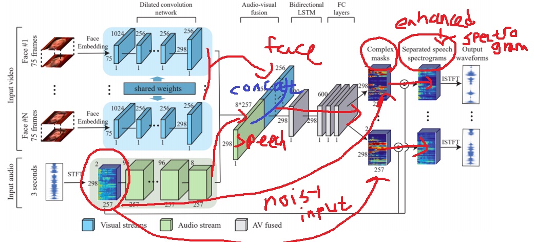 separated spectrogram을 inverse short time fourier transform을 이용하여 waveform으로 변환하면 각 face에 대응하는 speech(isolated speech signal for each speaker)가 된다.