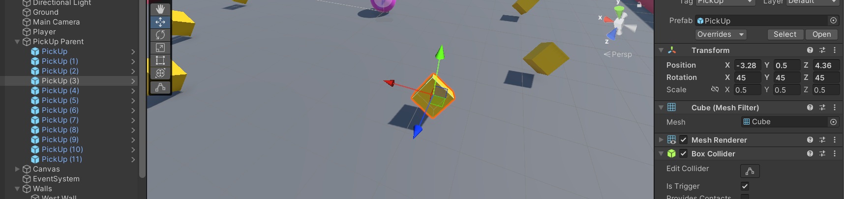 Rotator라는 script를 만들고 pickup 오브젝트에 붙여준다