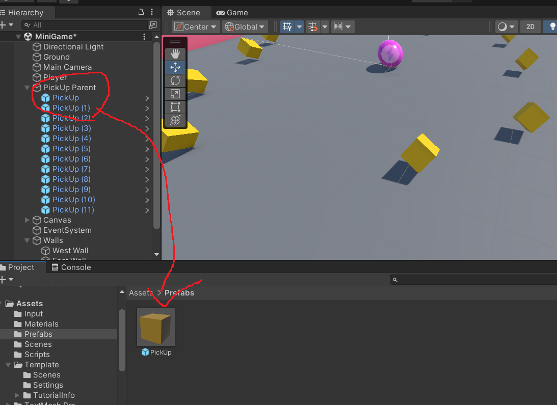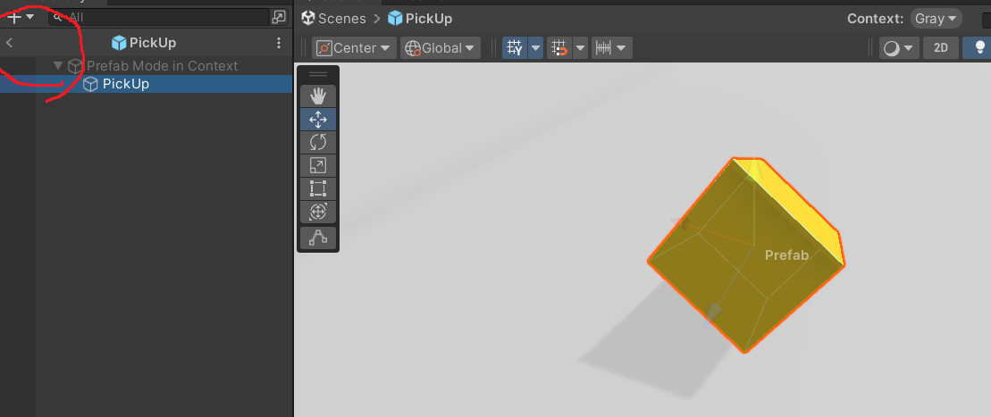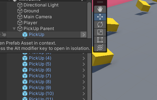 그리고 이렇게 prefab으로 만들면, hierarchy에서는 파란색으로 바뀌고 오른쪽에 화살표 표시가 있는데