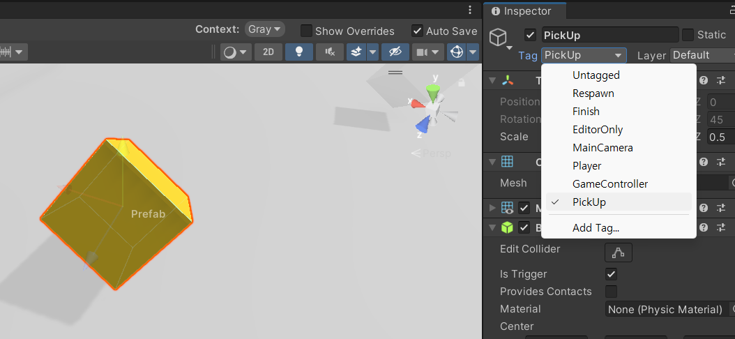 방법은 PickUp prefab에서 Box Collider 부분을 is Trigger에서 체크박스에 체크해주면 된다