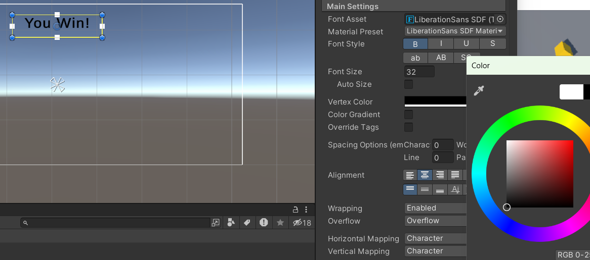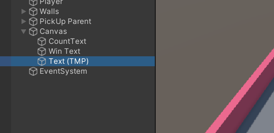 Hierarchy에서 UI - Text-TextMeshPro를 만들고 WinText라고 이름 바꾼 다음, 내용을 You Win!으로 바꾼다