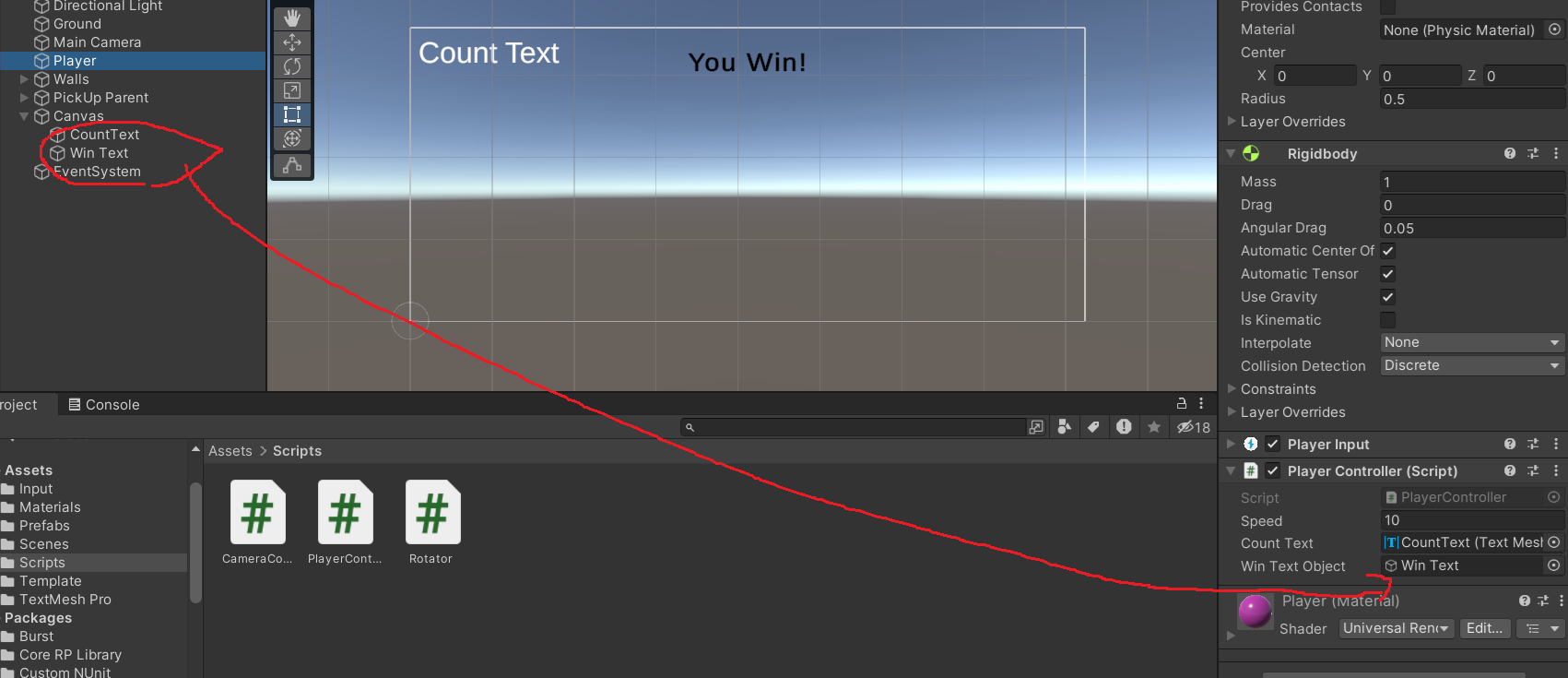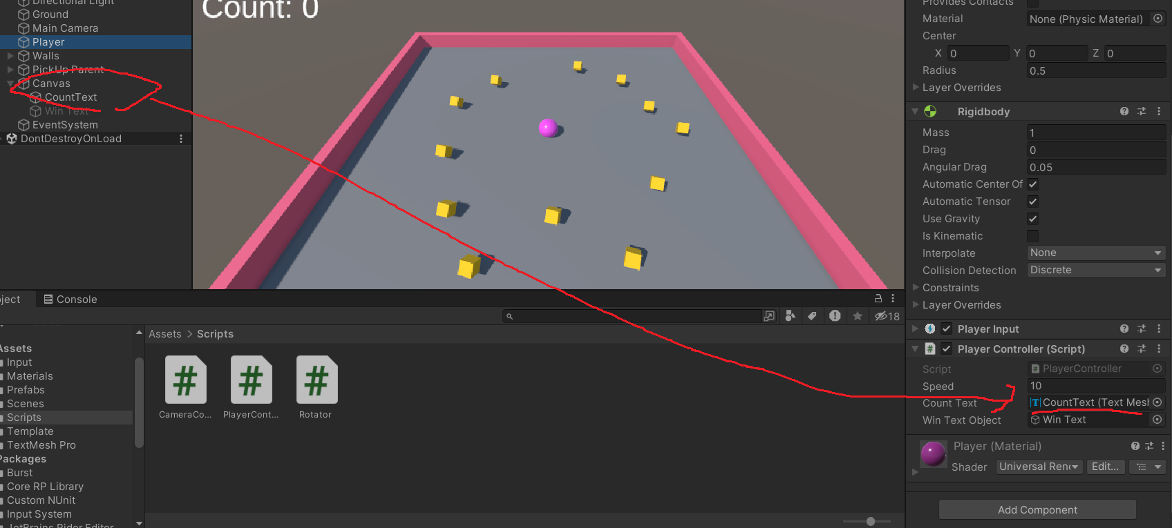 이제 플레이어가 먹은 오브젝트 수를 표시하기 위해, script에 연결시켜야하는데