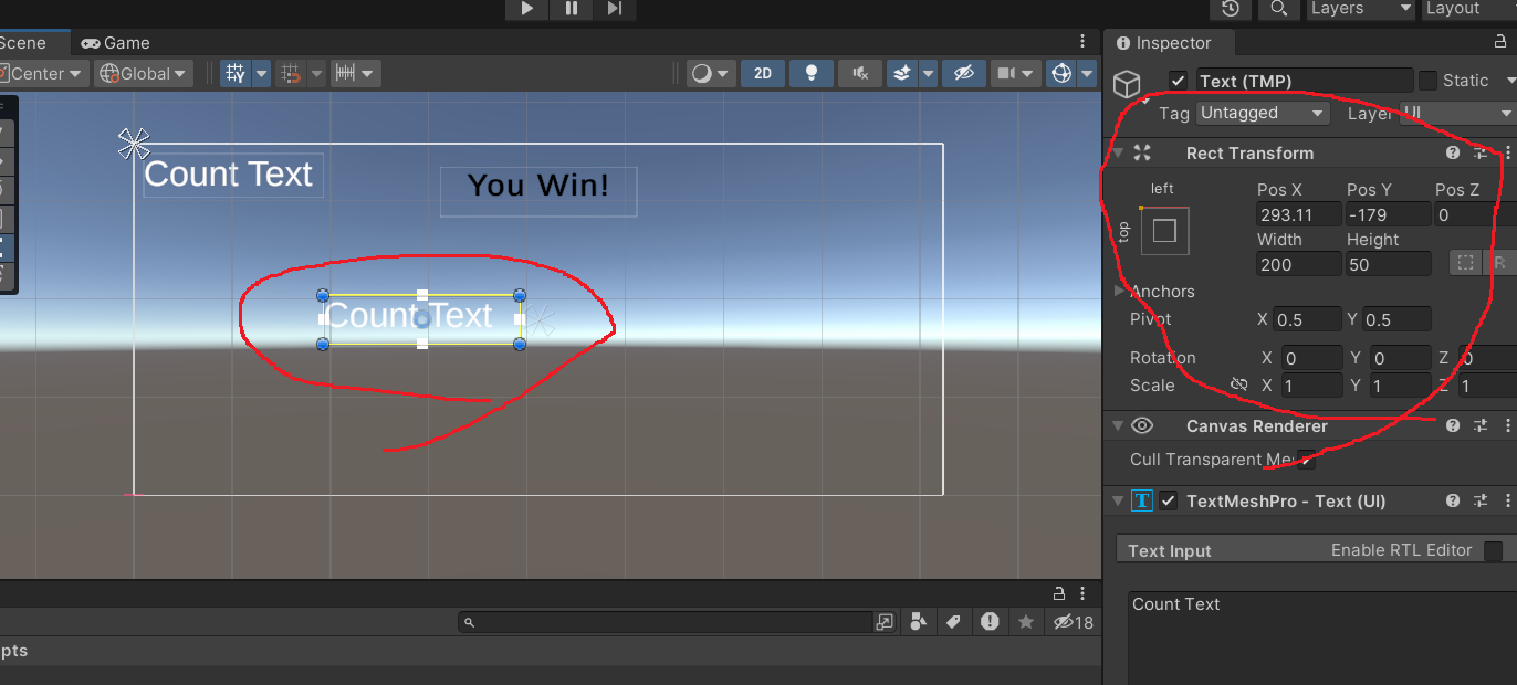 Rect Transform에서 위치를 조정하거나, 해당 text를 드래그하면 위치 조정이 가능