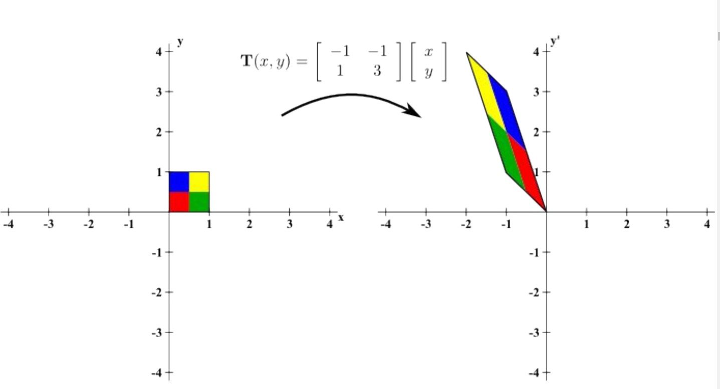 조금 더 복잡하게 주어진 정사각형을 늘리거나 회전시키거나 비틀어버리거나 하더라도 linear transformation
