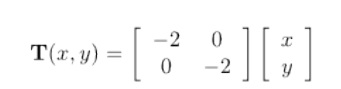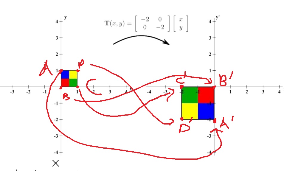 을 통해 변환하면 2배 늘어나고 회전된 정사각형 A’B’C’D’이 된다