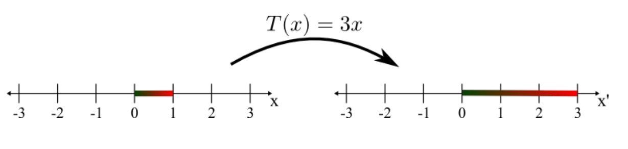 1차원의 [0,1]의 선분을 linear transformation T(x)=3x를 통해 변환하면 3배 늘어난 선분 [0,3]이 된다