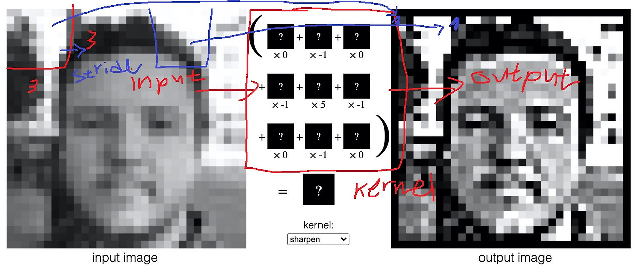 kernel을 input image위에서 stride하면서 convolution하여 output image를 뽑아냄