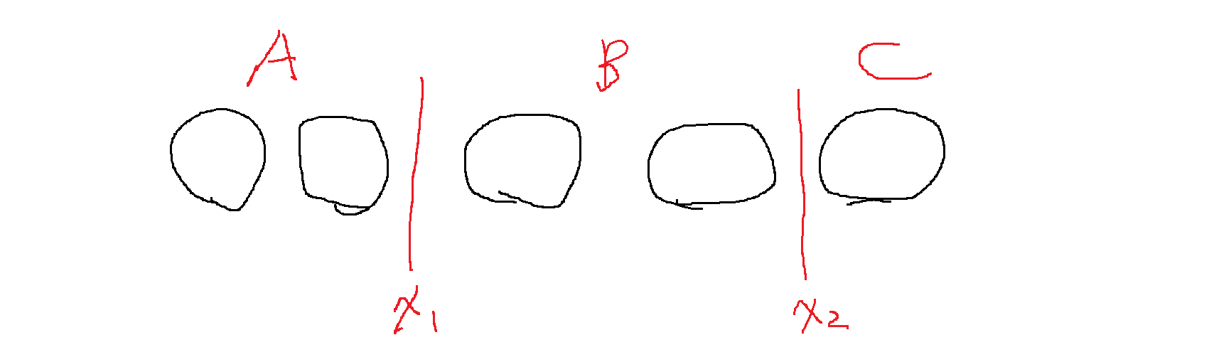 x1,x2 2개의 칸막이를 적당히 옮겨서 첫번째 영역에는 a를 전부 넣고, 두번째 영역에는 b를 전부 넣고