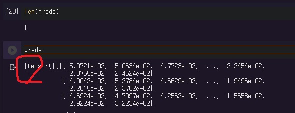 preds를 쳐보면 리스트 안에 하나의 output tensor가 들어있는 형태로 나온다