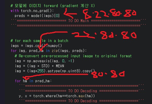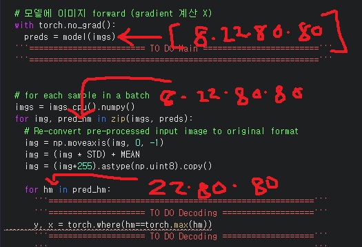 그래서 다음 줄 for img,pred_hm in zip(imgs,preds):에서 pred_hm이 그 중 1개인 22*80*80 tensor이 되는 것이고