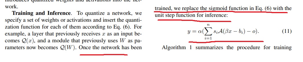 network의 train이 완료되면 inference단계에서는 완전히 quantization된 (e)의 step function을 사용하여 forward pass를 계산하여 inference를 수행함