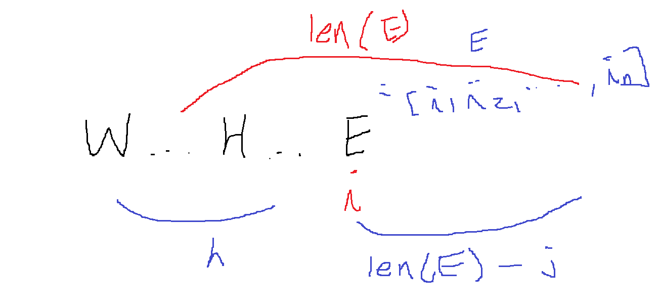 근데 이제 E를 만나면 현재까지 만든 WH의 개수는 h에 저장이 되어 있는데... 이 문자열에 E를 최소 2개이상 붙여야한다