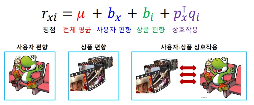 이번에는 상품의 평점은 전체 평점평균과 사용자의 편향, 상품의 편향, 사용자와 상품간의 상호작용의 합으로 나타난다고 보는것이다.