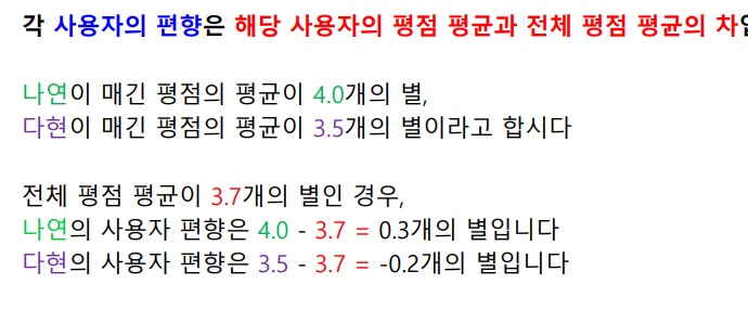 사용자의 편향은 해당 사용자가 매긴 평점들의 평균과 전체 상품들의 평점평균의 차이