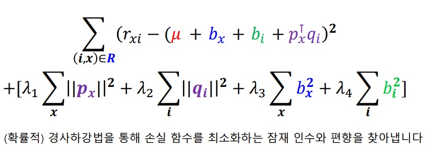 상품의 실제 평점과 추정한 평점(전체 평점평균, 사용자 편향, 상품 편향, 사용자 embedding과 상품 embedding의 내적의 합)의 차이가 최소가 되도록 하는 사용자 편향, 상품 편향, 사용자, 상품의 embedding을 찾는다.