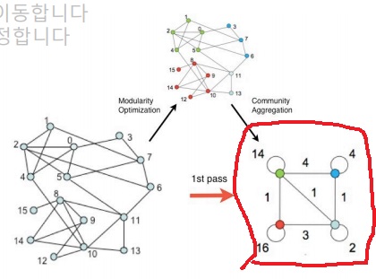 이 때 군집내 link weight를 모두 합쳐 하나의 weight로 만들어서 self-loop로 만들었다는 것이 보인다