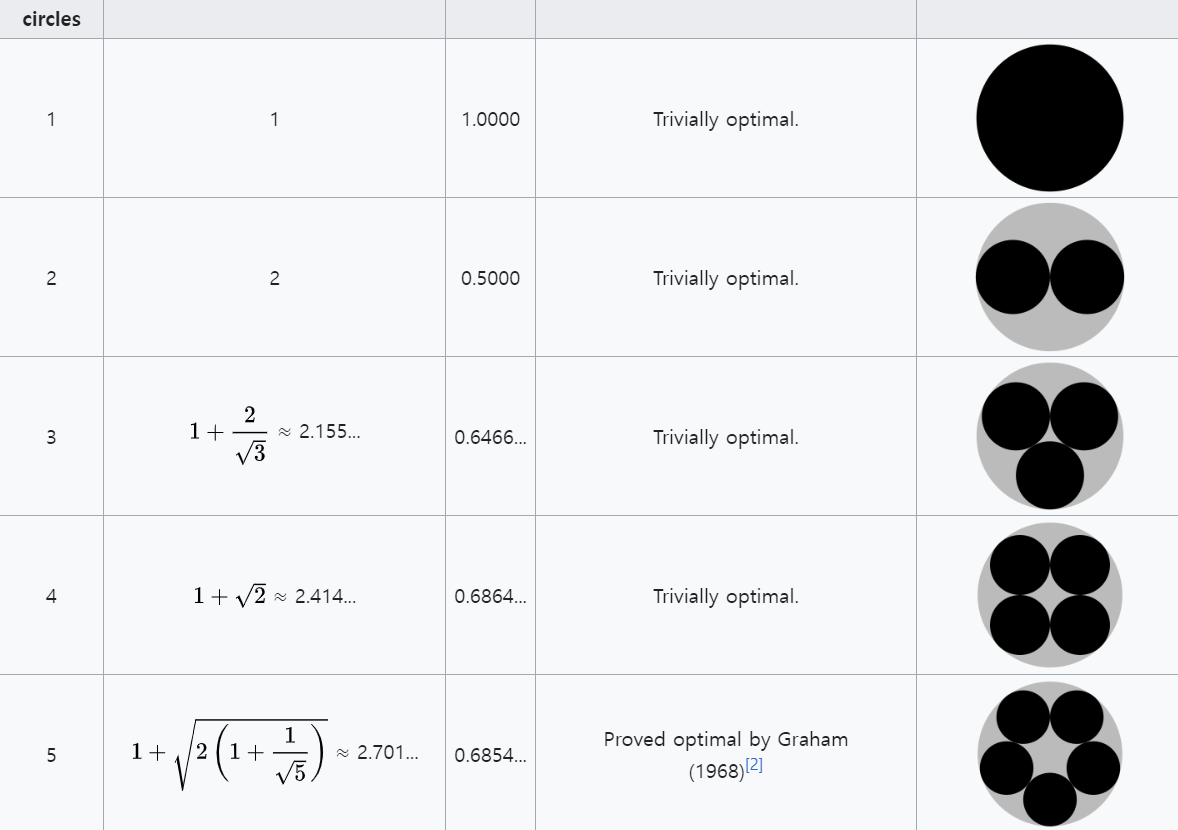 안에 채울려는 원의 반지름이 1일때 바깥 원의 반지름이 얼마여야하는지 구해놓은 표