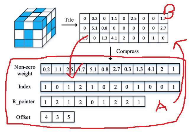 위 그림을 보면 unstructured pruning을 수행한 network를 tile화하여 sparse matrix로 표현