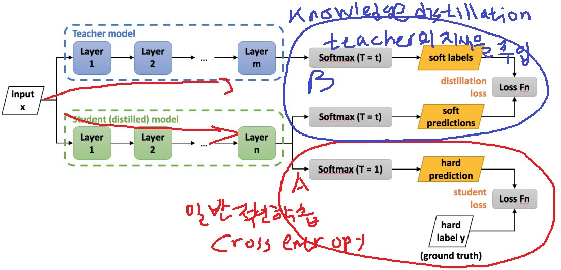 A부분에서는 student model의 hard prediction을 이용하여 ground truth와의 cross entropy를 이용한 일반적인 training이 이루어짐