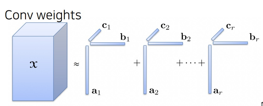 convolution weight tensor x를 vector a,b,c의 outer product(=rank one tensor)의 linear combination(summation)으로 근사적으로 분해함