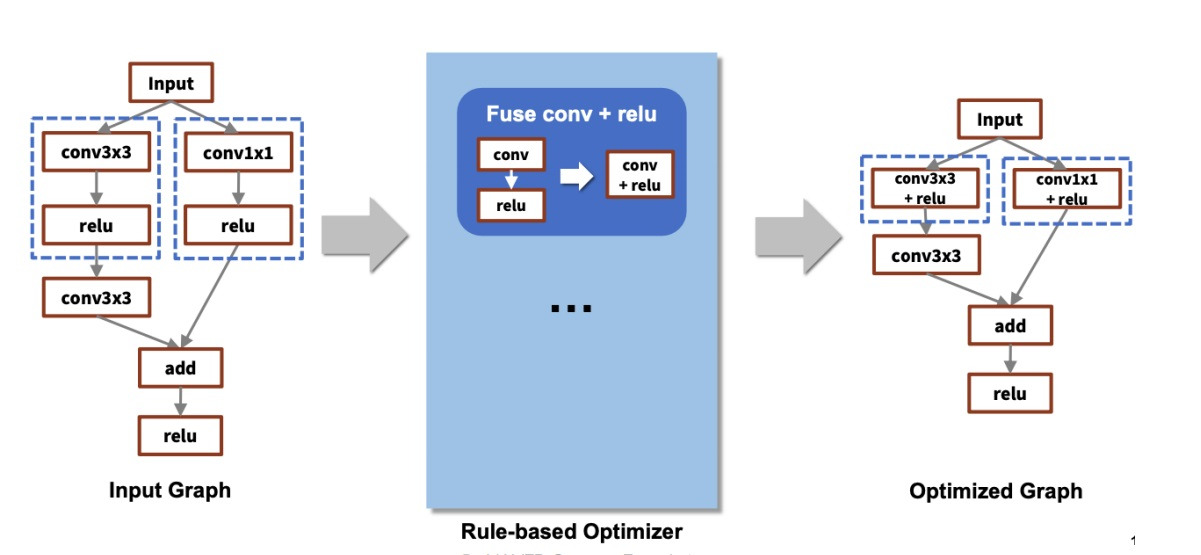 위 예시는 들어온 network에서 conv 다음 relu가 있으면 두 layer를 하나로 합쳐서 conv+relu로 만드라는 rule에 의해 fusion하는 과정