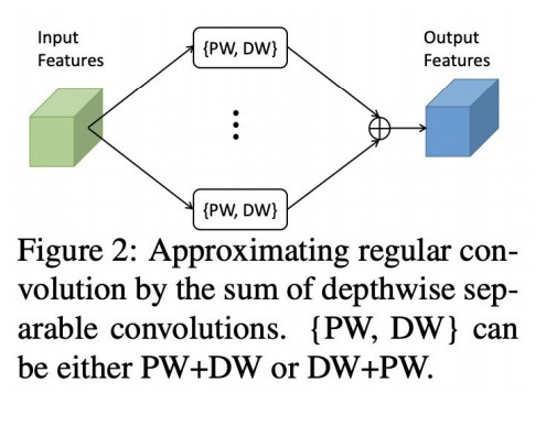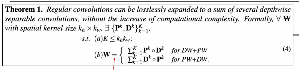 수학적으로 computing complexity를 올리지 않고 몇개의 depthwise separable convolution의 합으로 원래의 regular convolution을 equivalent하게 나타낼 수 있다.