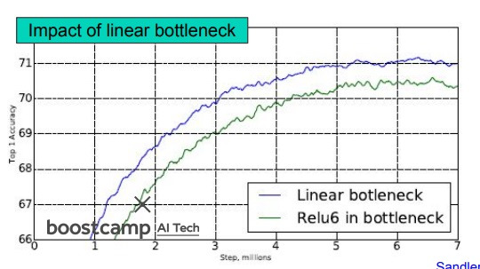 MobileNetV2의 경우 마지막 layer에 ReLU를 쓰지 않고 있는데 안쓰는게 성능이 좋았다고 한다