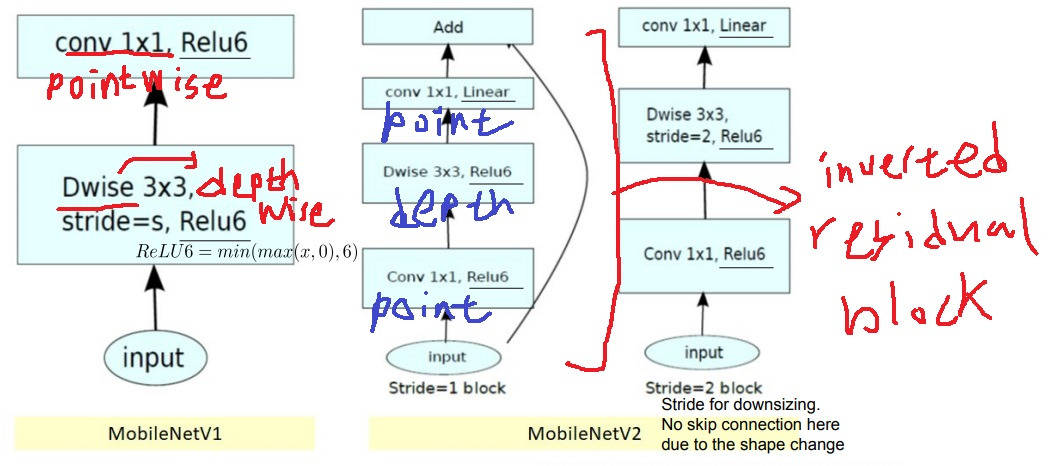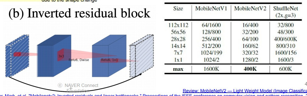 MobileNetV2는 pointwise convolution을 수행하고 depthwise convolution을 수행하고 pointwise convolution을 수행하여 순서를 뒤집었더니 계산량을 획기적으로 줄였다