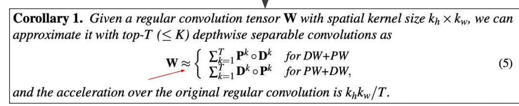 따름정리로 주요 top-T개의 principal component depthwise separable convolution의 합으로 원래의 regular convolution을 approximation할 수 있다
