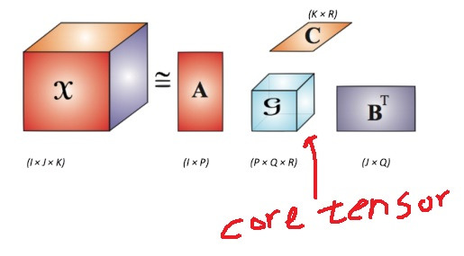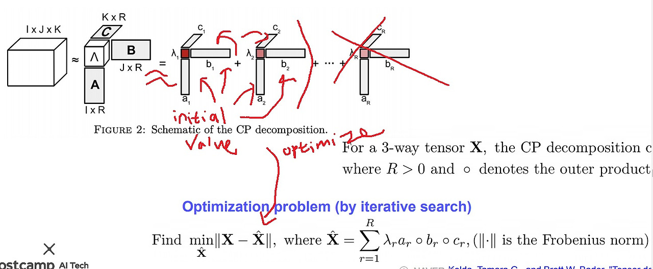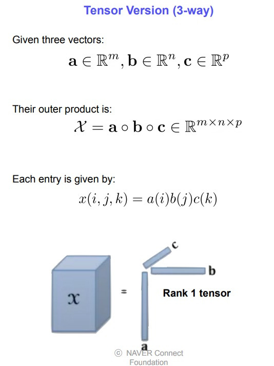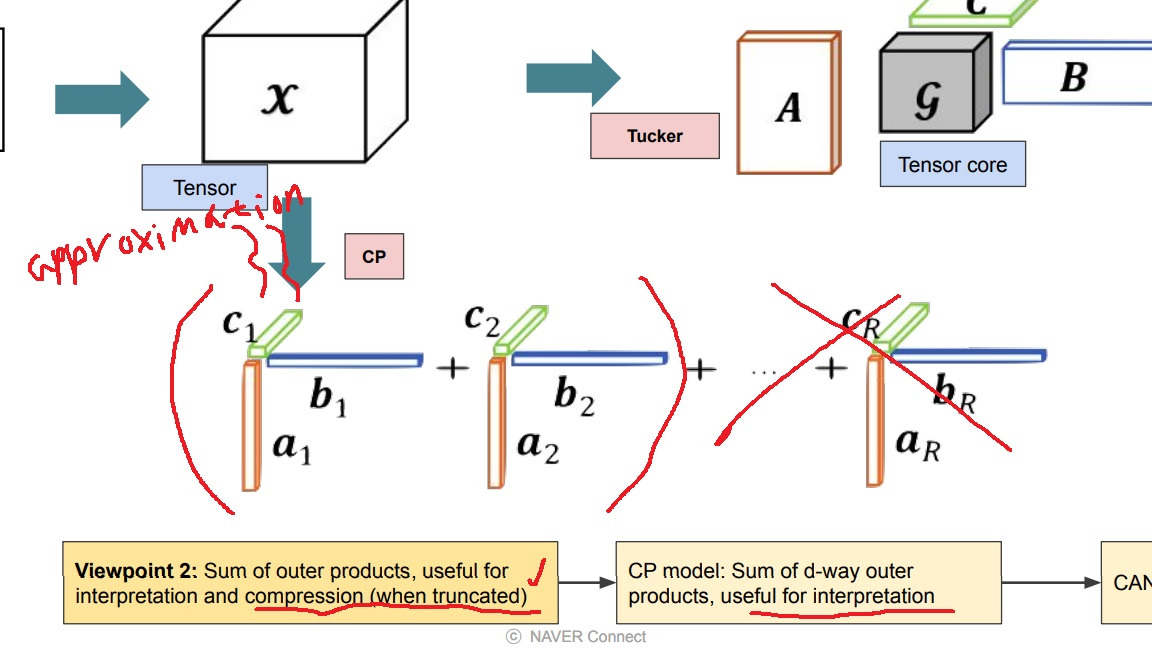 수학적으로 $x \approx \sum_{r = 1}^{R} \lambda a_{r} \circ b_{r} \circ c_{r}...$