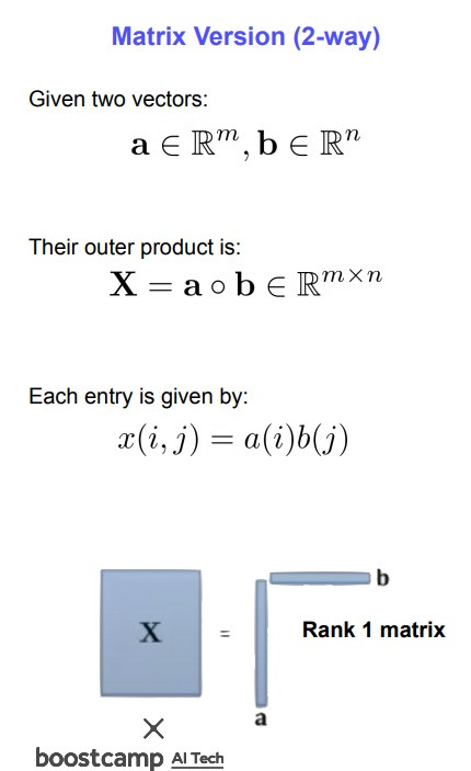 두 벡터 a ∈ $R^{m}$ , b ∈ $R^{n}$에 대하여 a와 b의 outer product는 하나의 m*n행렬 X = a ⊙ b를 나타낸다.