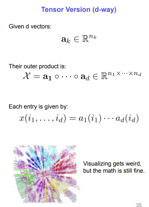 더욱 일반적으로 d개의 벡터 $a_{k} ∈ R^{n_{k}}$ ,k=1,2,...,d를 이용해 outer product를 하면 d차원 tensor x = a1 ⊙ a2 ⊙ a3 ⊙ ... ⊙ ad를 얻는다