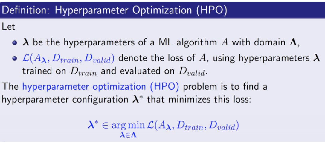 계산되는 loss 𝓛($A_{\lambda}$,Dtrain,Dvalid)를 최소화시키는 hyperparameter의 특정한 configuration $\lambda$ *를 찾는 문제이다.
