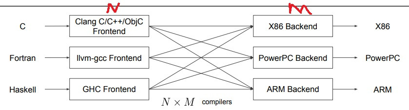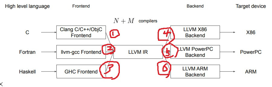 C - LLVM IR, Fortran - LLVM IR, Haskell - LLVM IR로 번역해주는 N개의 compiler는 N개의 다양한 언어를 하나의 LLVM IR로 번역시킴
