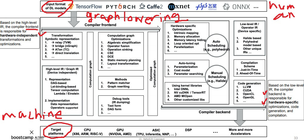 tensorflow나 pytorch의 graph들이 low level로 변환되기 위해서 다양한 framework에 맞게 다양한 compiler들이 변환을 시키는데