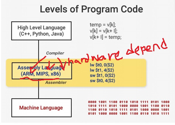 assembly language는 보통 hardware dependent하여 compiler가 hardware에 따라 다르게 번역함