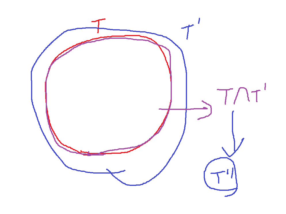 T에서 T 와 T ' 의 교집합의 정점을 하나의 정점으로 축약시켜 얻은 트리가 T ''이라고 하자.