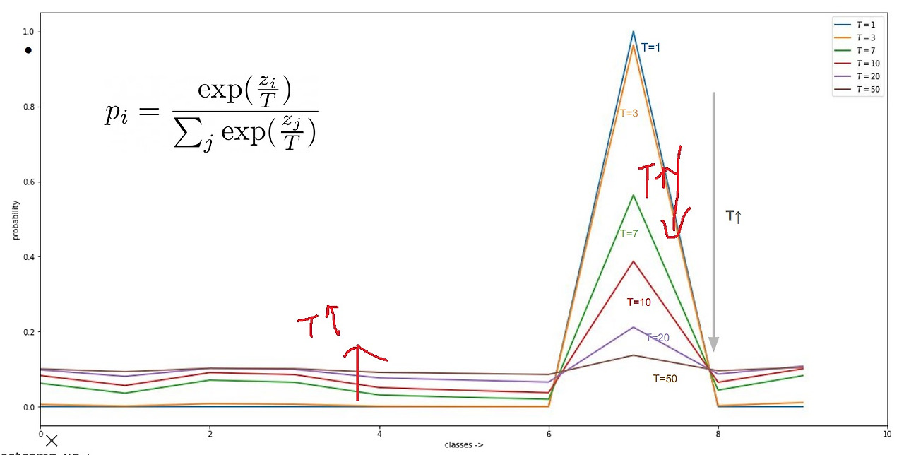 그래서 softmax함수의 logit z에 T로 나눠서 이러한 점을 반영한 것이 변형된 softmax함수이고 이것 마저도 지식으로 배워야한다는 것임