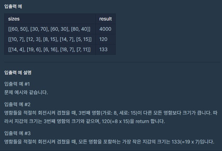 문제 설명을 보면 가로의 길이 max * 세로의 길이 max인 명함 지갑을 만들어야 한다는 것을 알 수 있음
