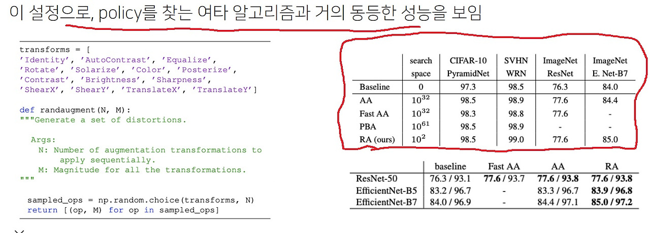 그러면 이 N,M을 정하고 미리 선정한 후보중에서 N개를 임의로 골라 M만큼의 augmentation을 다 적용해보면서 최적의 augmentation을 찾는다는 방법