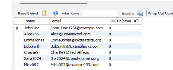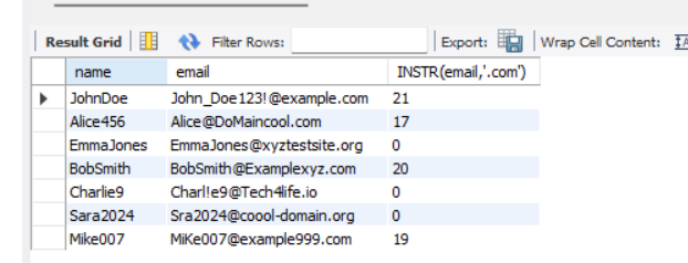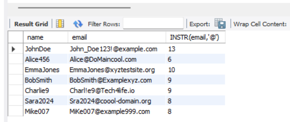 select name,email,INSTR(email,'@') from person;