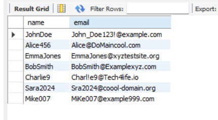 ('Alice456', 'Alice@DoMaincool.com'),