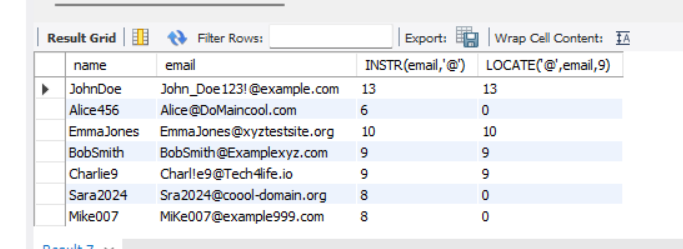 select name,email,INSTR(email,'@'),LOCATE('@',email,9) from person;