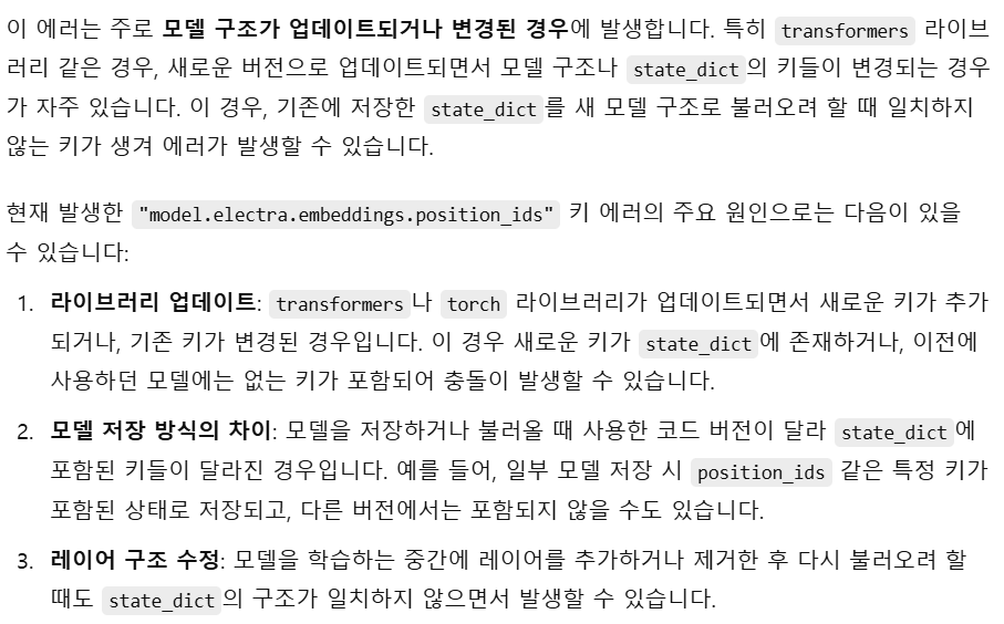 이 에러가 난 이유는 역시 이전 학습환경과 현재 transformers나 pytorch 라이브러리 등의 버전이 맞지 않아서이다.